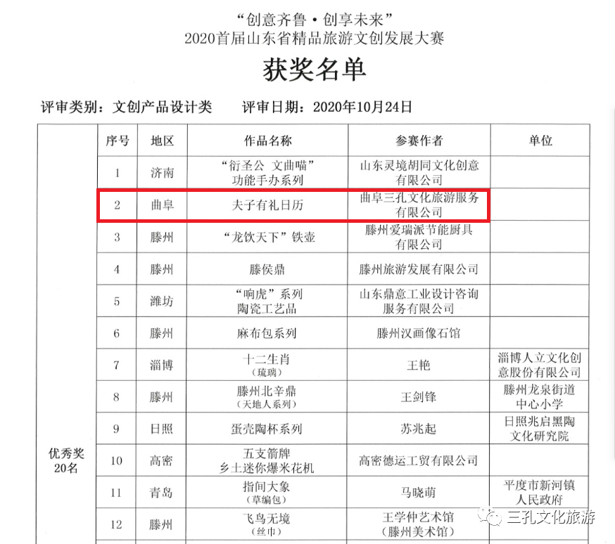 近日,“2020首屆山東省研學旅行創(chuàng)新線路設計大賽“及“2020首屆山東省精品旅游文創(chuàng)發(fā)展大賽”頒獎典禮在濟南山東大廈禮樂廳舉行。精品旅游文創(chuàng)發(fā)展大賽由山東省總工會、山東省新舊動能轉(zhuǎn)換綜合試驗區(qū)建設辦公室、山東省人力資源和社會保障廳、山東省文化和旅游廳、山東省精品旅游促進會共同主辦,活動嚴格按照統(tǒng)一報名參賽、網(wǎng)絡投票、專家評審、組委會審核等程序,最終研究確定了獲獎名單。曲阜市三孔文化旅游服務有限責任公司報送的《探尋孔子足跡 走近精神家園》線路設計獲得2020首屆山東省研學旅行創(chuàng)新線路設計大賽二等獎,“夫子有禮日歷”獲得2020首屆山東省精品旅游文創(chuàng)發(fā)展大賽優(yōu)秀獎。