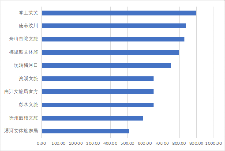 綜合全年的傳播數(shù)據(jù)來看,2020年縣級文化和旅游主管部門的抖音傳播力指數(shù)TOP10排序為:掌上萊蕪、康養(yǎng)汶川、舟山普陀文旅、梅里斯文體旅、玩轉梅河口 、資溪文旅、曲江文旅局官方、彭水文旅、徐州鼓樓文旅、漠河文體旅游局。