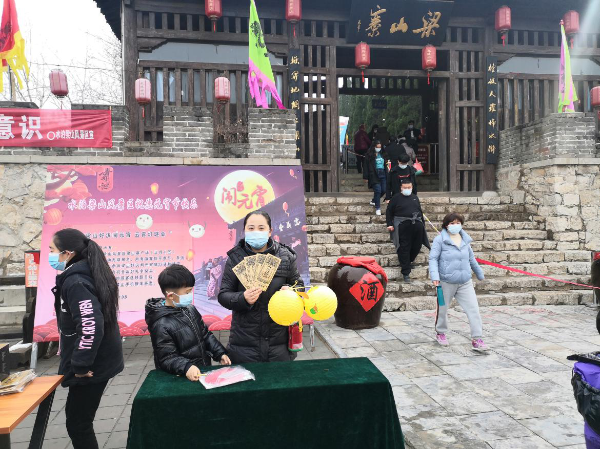節(jié)日當(dāng)天,水泊梁山風(fēng)景區(qū)在線上、線下同時(shí)推出“猜燈謎,搶禮品”活動(dòng)。直播間內(nèi),網(wǎng)友們積極參與,與主播互動(dòng),將人氣推向高潮。梁山寨廣場(chǎng)兩側(cè)懸掛大紅燈籠,張貼謎語(yǔ),各種燈謎,品類(lèi)眾多,主要以好漢人物常識(shí)和水滸知識(shí)為主。活動(dòng)通過(guò)大眾喜聞樂(lè)見(jiàn)的方式,傳遞普及水滸文化,受到廣大游客的一致好評(píng),也展現(xiàn)出別樣的水滸魅力。