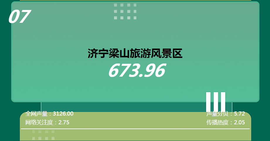壹點(diǎn)智庫(kù)是以齊魯晚報(bào)特有的品牌傳播力等資源,對(duì)各行業(yè)領(lǐng)域、品牌、企業(yè)等進(jìn)行專業(yè)化、科學(xué)化、數(shù)據(jù)化、系統(tǒng)化的研究和評(píng)價(jià),具有較高的權(quán)威性和參考價(jià)值。目前涵蓋山東省內(nèi)上市企業(yè)、公共品牌、景區(qū)、高等院校4個(gè)領(lǐng)域。其中,山東知名景區(qū)“網(wǎng)絡(luò)傳播影響力(INC)指數(shù)”以壹點(diǎn)大數(shù)據(jù)、蛙眼大數(shù)據(jù)、搜索大數(shù)據(jù)、社交大數(shù)據(jù)四大數(shù)據(jù)為基礎(chǔ),綜合評(píng)價(jià)了信息傳播廣度(即全網(wǎng)聲量)、傳播熱度、網(wǎng)絡(luò)關(guān)注度等指標(biāo),并衍生出策劃力匹配度指標(biāo),為景區(qū)全面了解信息傳播數(shù)據(jù)、精準(zhǔn)制定傳播策略提供有價(jià)值的參考。